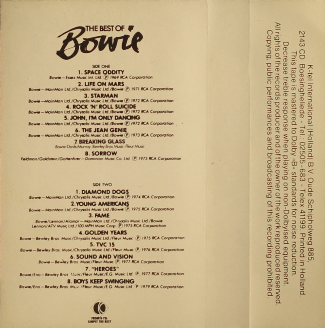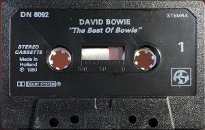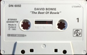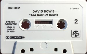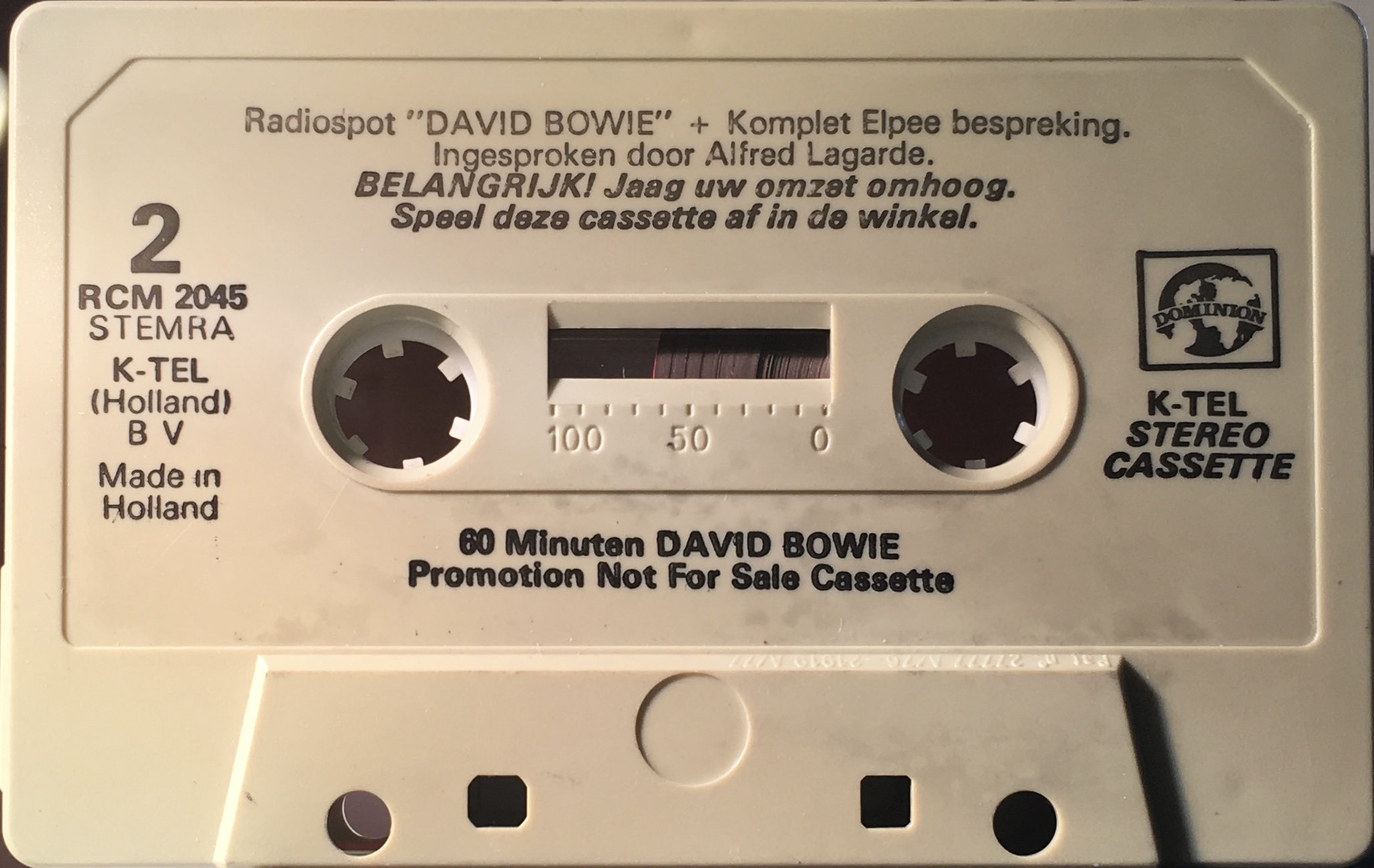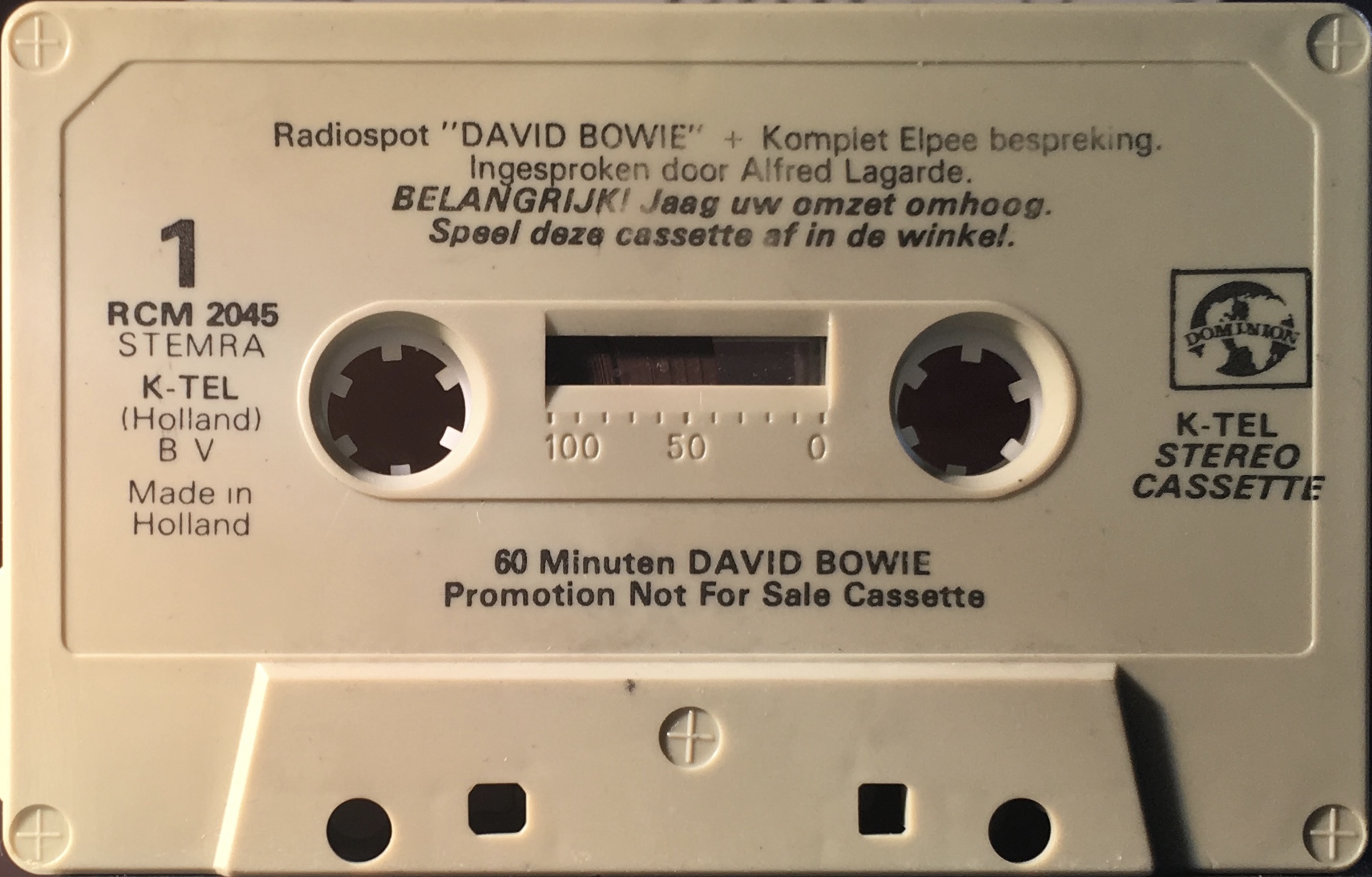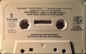 No cover. Promotional item not for sale. The cassette has a spoken advert for K-tel’s ‘The Best Of Bowie’ featuring snippets of Golden Years; Fame; The Jean Genie; Heroes and Space Oddity, played at intervals between tracks from the album, all with spoken introduction in Dutch.