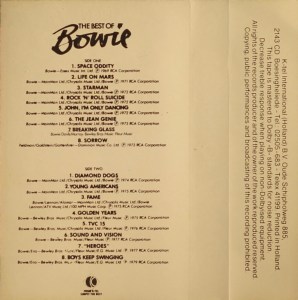 Side 1: Space Oddity; Life On Mars; Starman; Rock ‘N’ Roll Suicide; John I’m Only Dancing; The Jean Genie; Breaking Glass; Sorrow.
