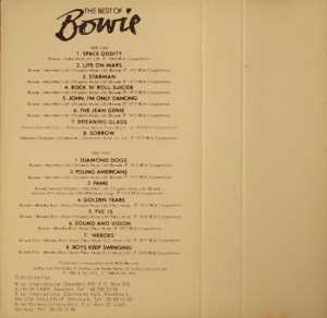 Side 1: Space Oddity; Life On Mars; Starman; Rock ‘N’ Roll Suicide; John I’m Only Dancing; The Jean Genie; Breaking Glass; Sorrow.