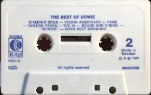 Side 2: Diamond Dogs; Young Americans; Fame; Golden Years; TVC 15; Sound And Vision; “Heroes”; Boys Keep Swinging.