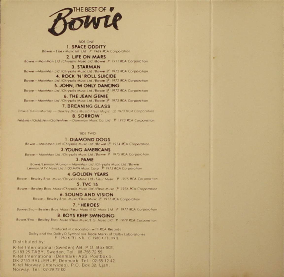 Side 2: Diamond Dogs; Young Americans; Fame; Golden Years; TVC 15; Sound And Vision; “Heroes”; Boys Keep Swinging.