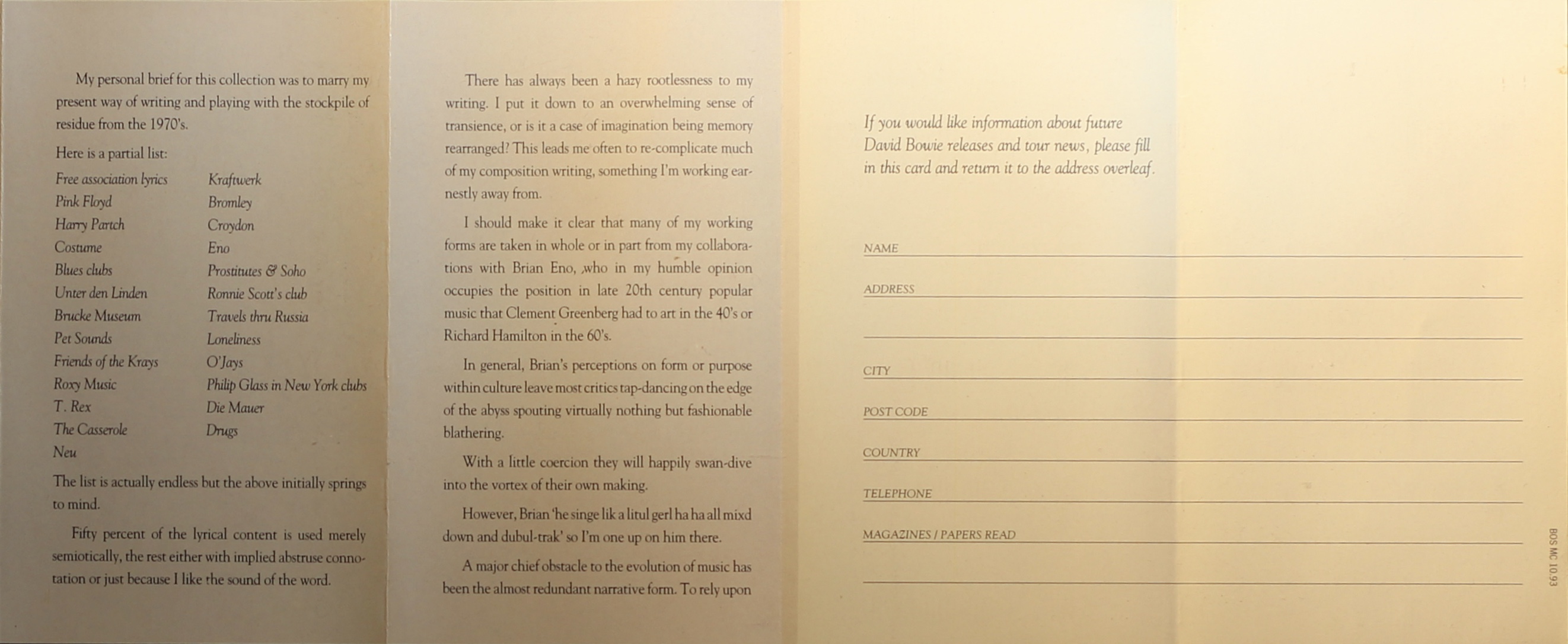 Full photo cover. Folded, glossy paper with extensive notes written by David Bowie and dated Sept. 15th 1993 across both sides of the cover. The final panels can be detached into a postcard sized enquiry form for the David Bowie Information Service, these are often missing. Track list on rear and inner panel, ‘Industria Grafica Boccadoro s.r.l. ‘on inner cover. SIAE stamp on spine and ‘Printed In Italy’ on the rear cover. Rear panel and spine are pale lilac in colour.