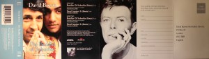 Full front panel picture on five-panel concertina cover. Blue spine and rear panel with track list on it and black inner panels with track list on one picture the other. The two final white panels form a postcard for the ‘David Bowie Information Service’.