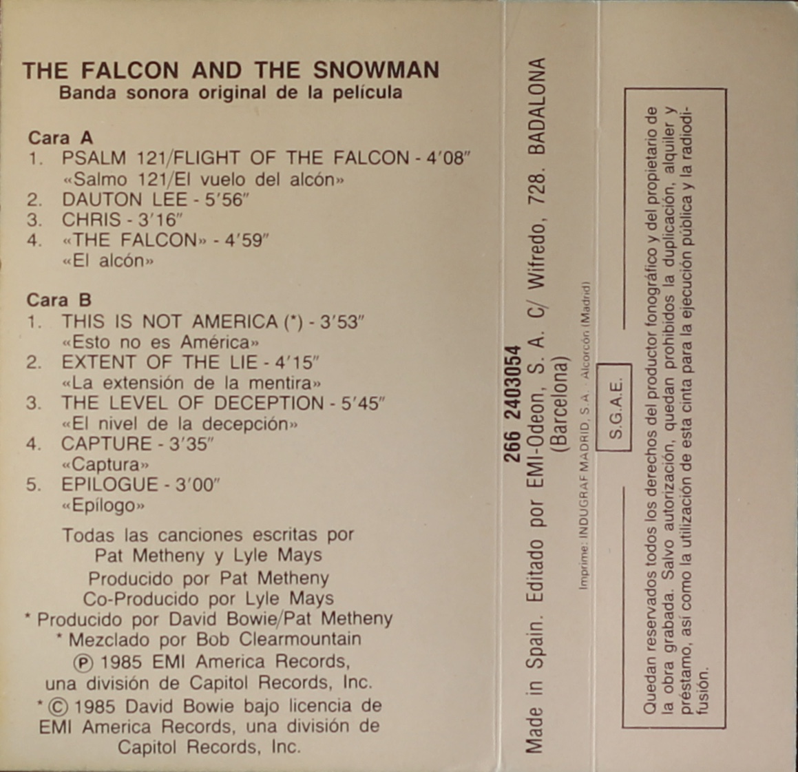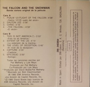 The Falcon And The Snowman: Spain; EMI America, 266 2403054 (SV 17150); 1985.