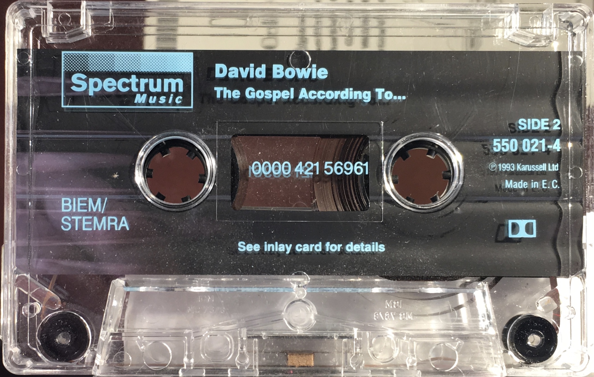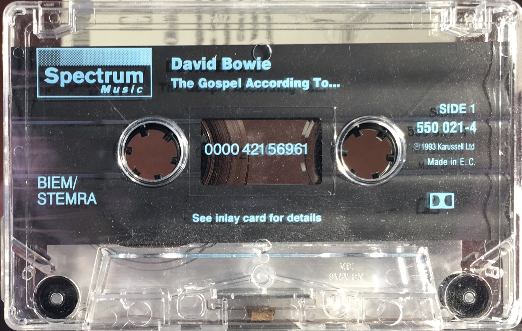 Blue ink on clear shell with plain slip sheet; Spectrum and Karussell logos with BIEM/ STEMRA rights.