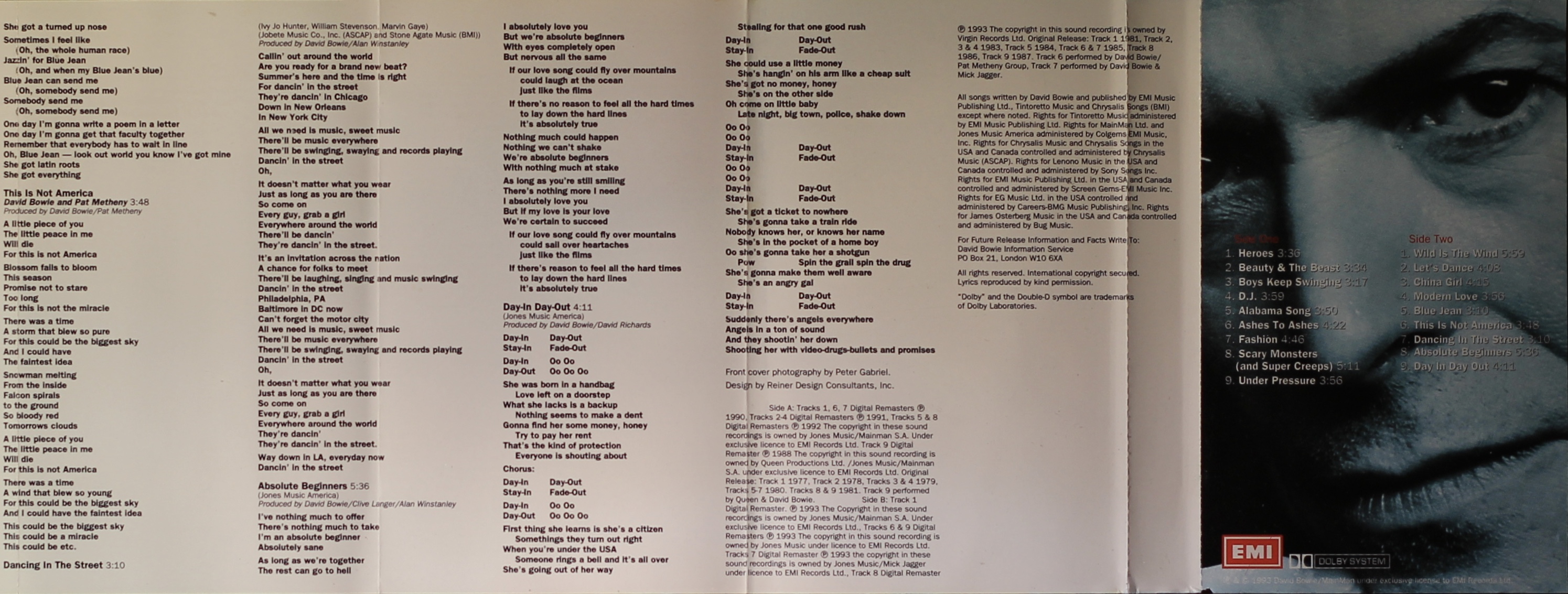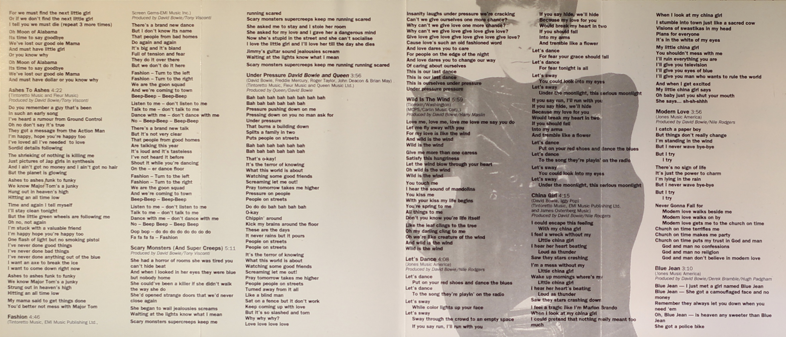 Side 2: Wild Is The Wind; Let’s Dance; China Girl; Modern Love; Blue Jean; This Is Not America; Dancing In The Street; Absolute Beginners; Day-In Day-Out.