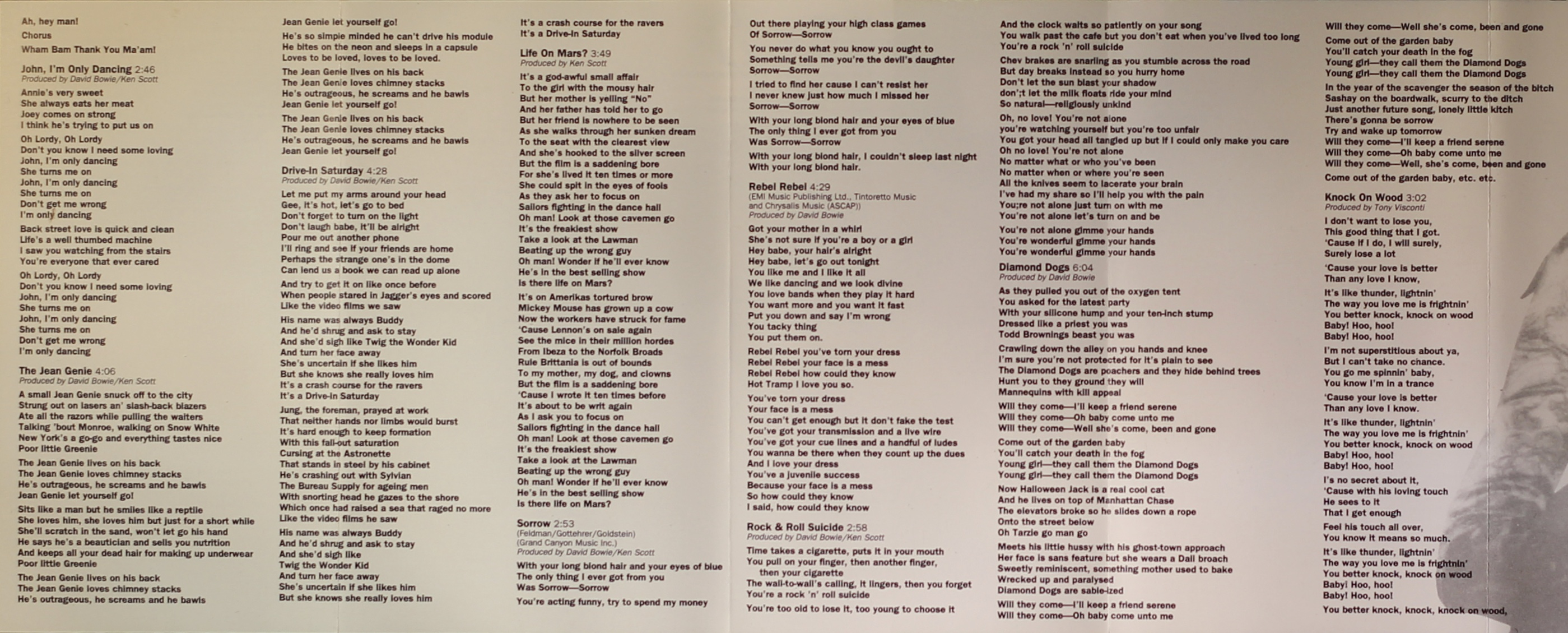 Side 2: Rebel Rebel; Rock & Roll Suicide; Diamond Dogs; Knock On Wood; Young Americans; Fame; Golden Years; TVC 15; Sound & Vision.
