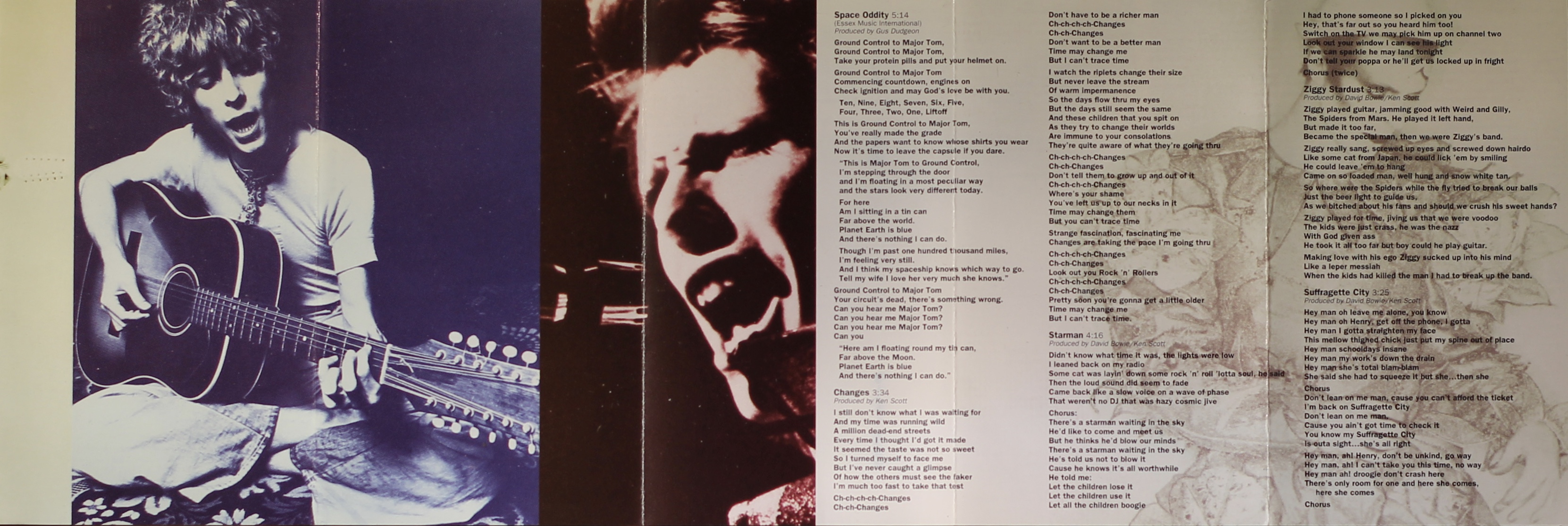 Side 1: Space Oddity; Changes; Starman; Ziggy Stardust; Starman; Ziggy Stardust; Suffragette City; John I’m Only Dancing; The Jean Genie; Drive-in Saturday; Life On Mars?; Sorrow.