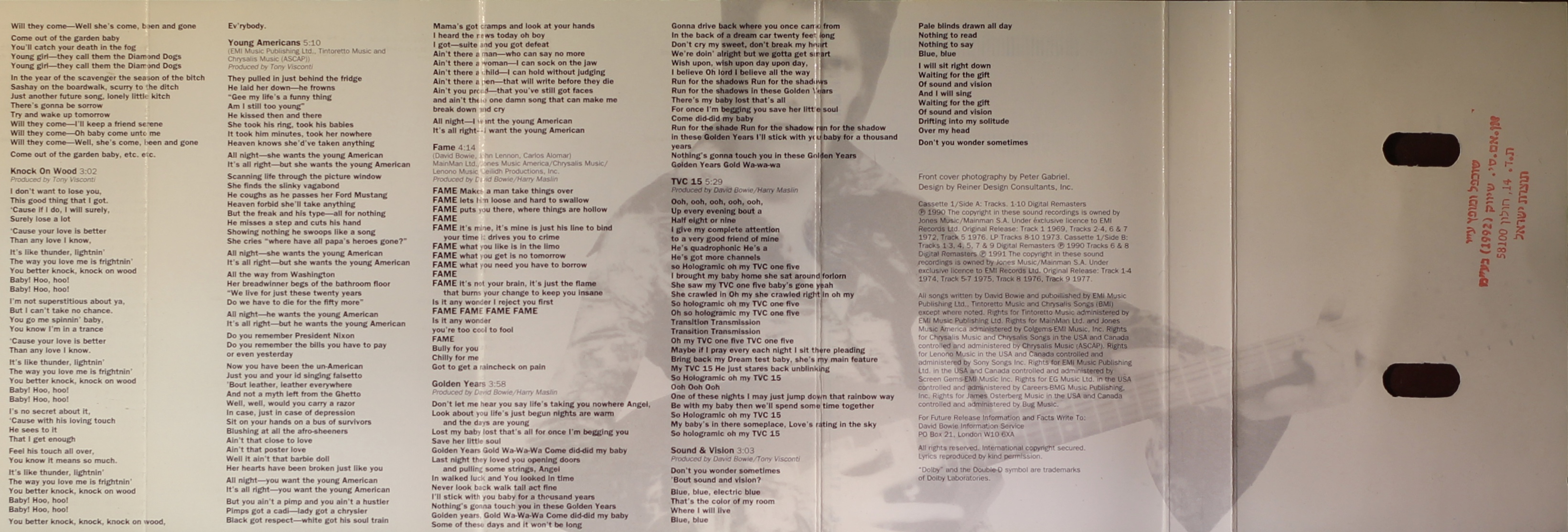 Side 2: Rebel Rebel; Rock & Roll Suicide; Diamond Dogs; Knock On Wood; Young Americans; Fame; Golden Years; TVC 15; Sound & Vision.