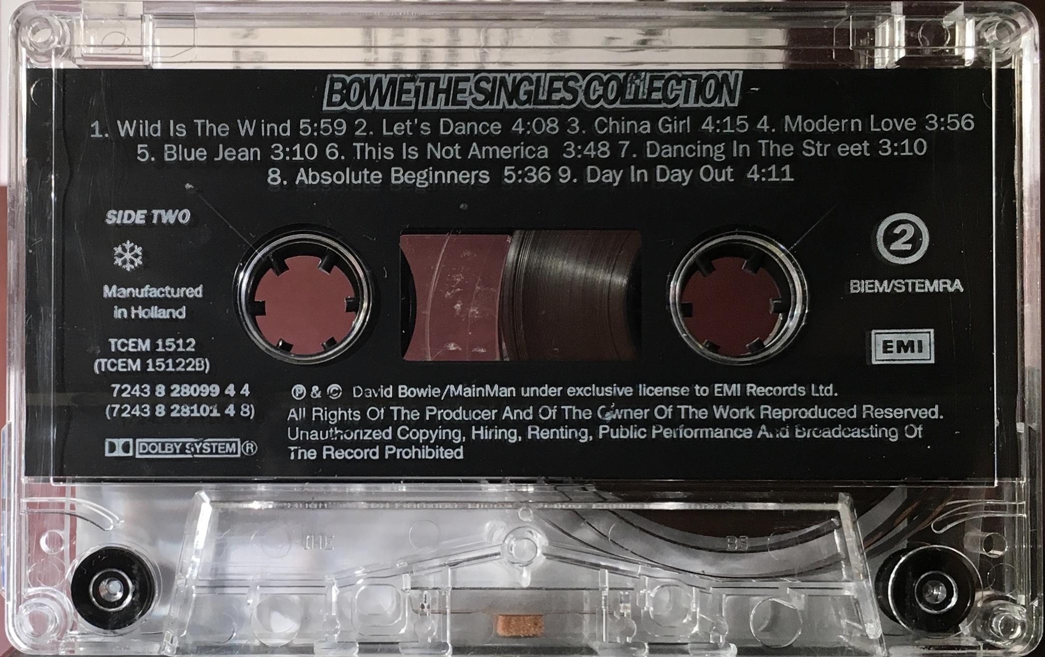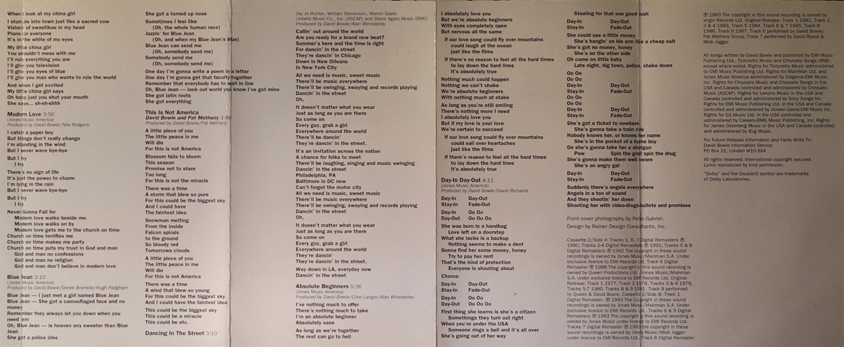 Side 2: Wild Is The Wind; Let’s Dance; China Girl; Modern Love; Blue Jean; This Is Not America; Dancing In The Street; Absolute Beginners; Day-In Day-Out.
