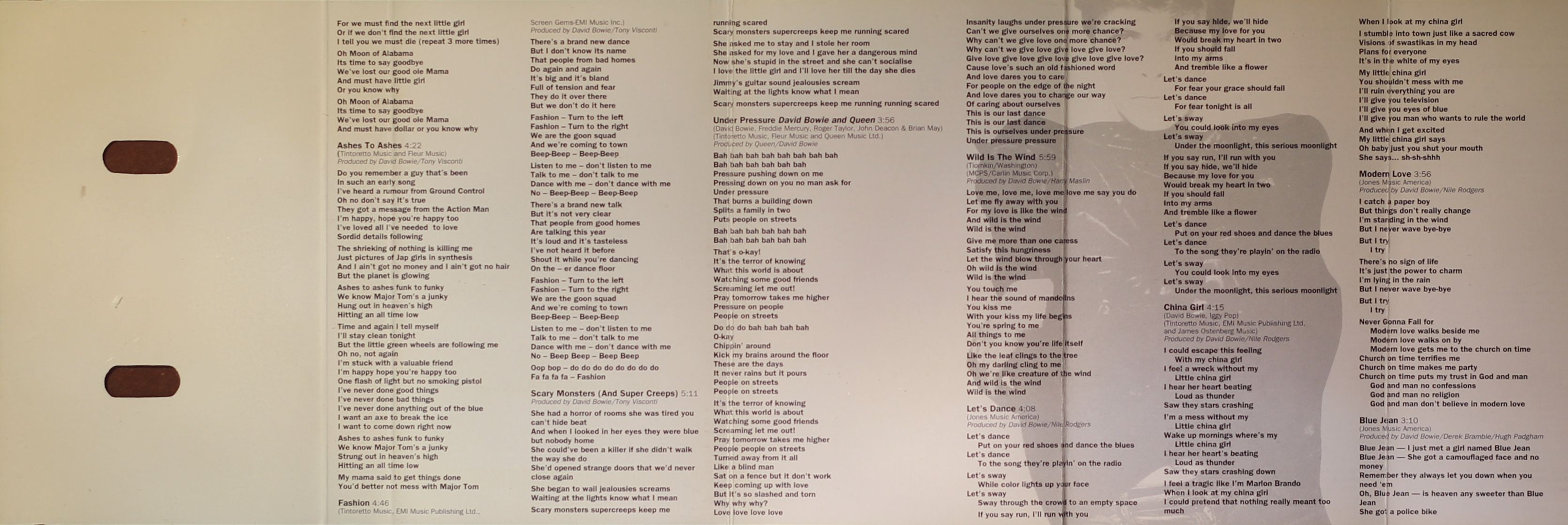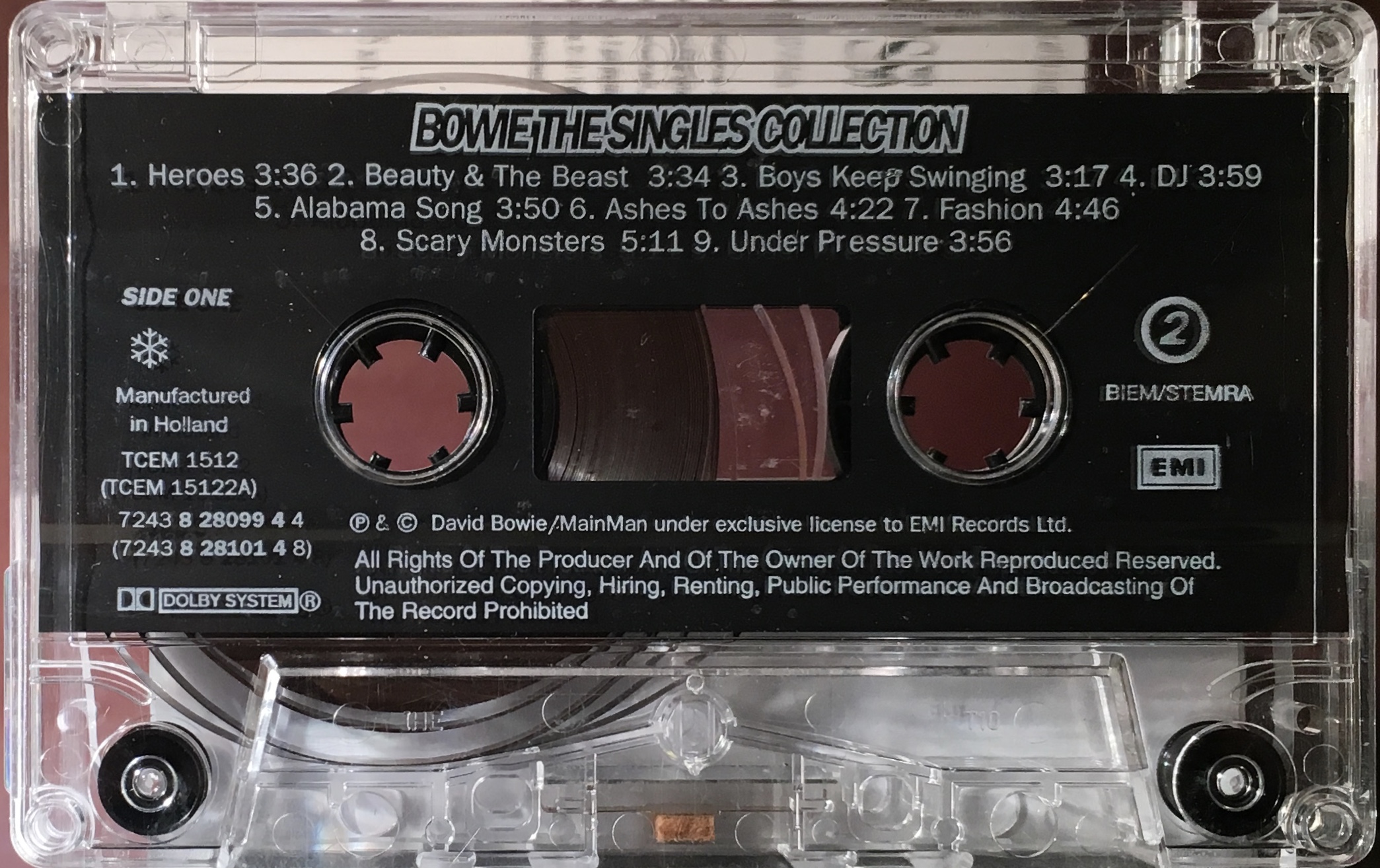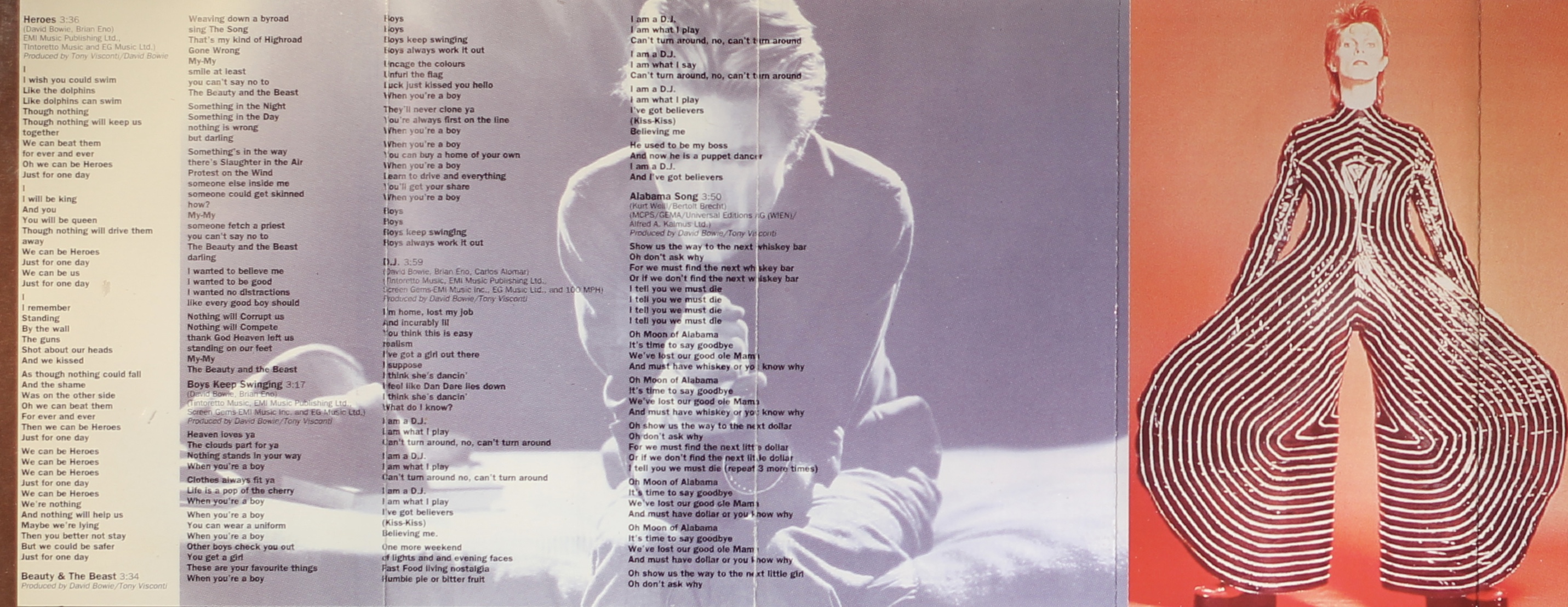 Side 1: Heroes; Beauty & The Beast; Boys Keep Swinging; DJ; Alabama Song; Ashes To Ashes; Fashion; Scary Monsters (and super creeps); Under Pressure.