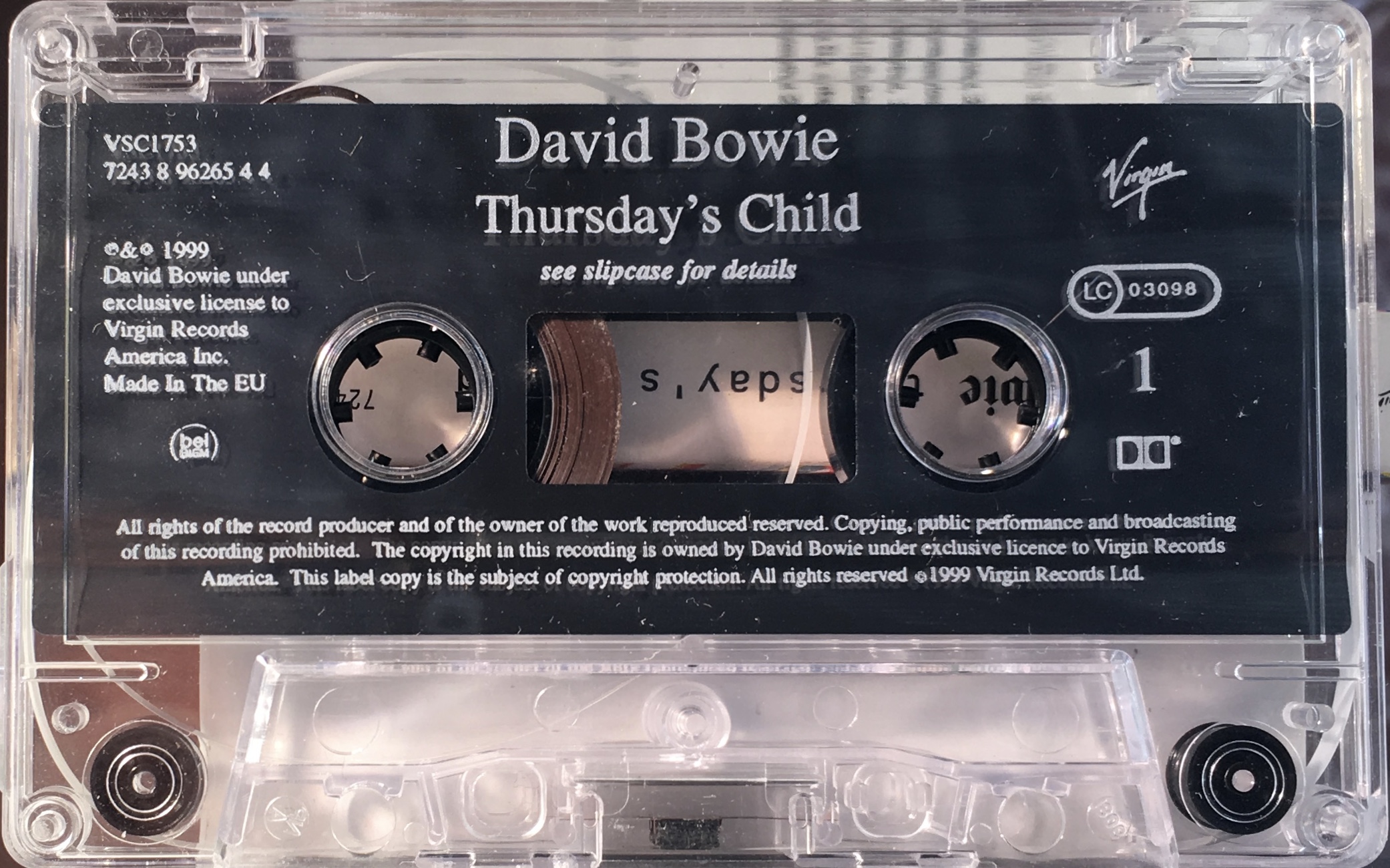 White ink printed directly onto clear shell with plain slip sheet and ‘Virgin’ logo and ‘bel/BIEM’ rights on shell. All information in English and ‘Made in the EU’.
