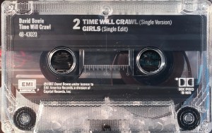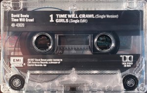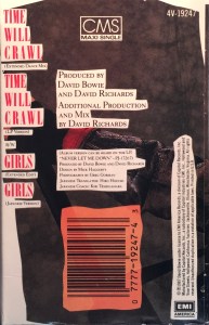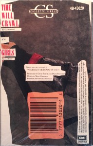 All picture panel card slip-case; no long-box. Track list on rear panel. ‘Manufactured by Capitol Records Inc’. The rear cover has a barcode and there is the ‘CS’ (cassette single) logos on the spine. The timings are: Time Will Crawl (single version)(3:58); Girls (single edit)(4:14).