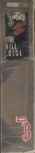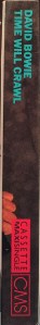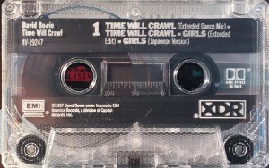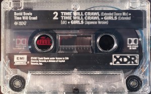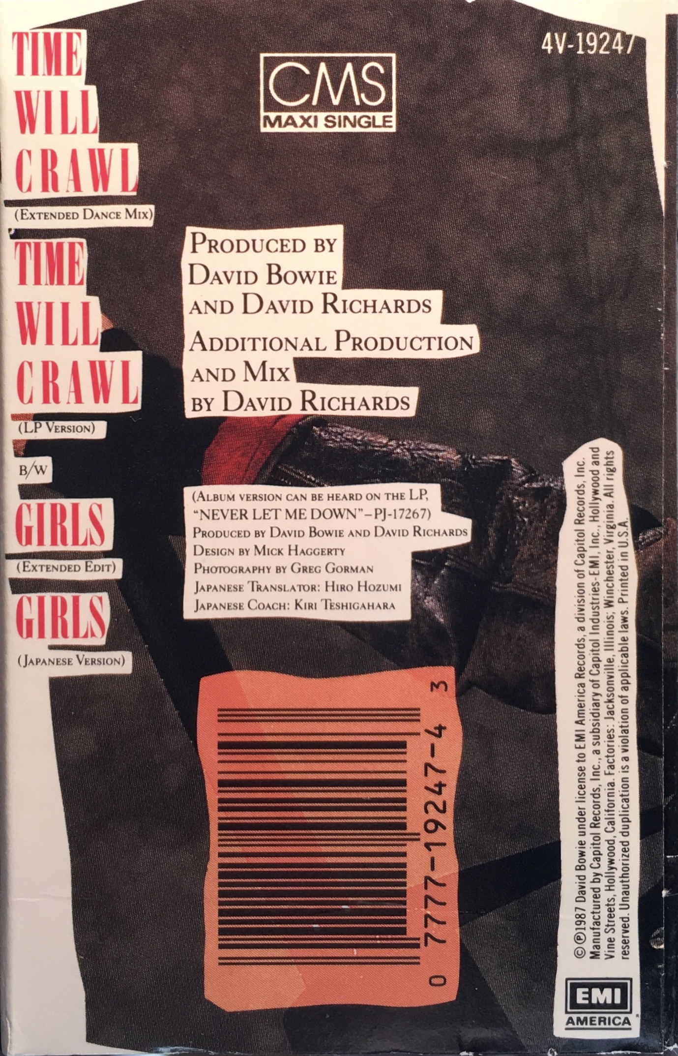 The cassingle slip case has ‘Manufactured by Capitol Records Inc’, ‘CMS’ (cassette maxi-single) and ‘EMI America’ on the rear and ‘CMS’ and ‘Time Will Crawl’ on the sides. Additional credits shown on the rear panel for Japanese translator Hiro Hizumi, and coach Kiri Teshigahara. ‘XDR’ not shown on slip case or long box.