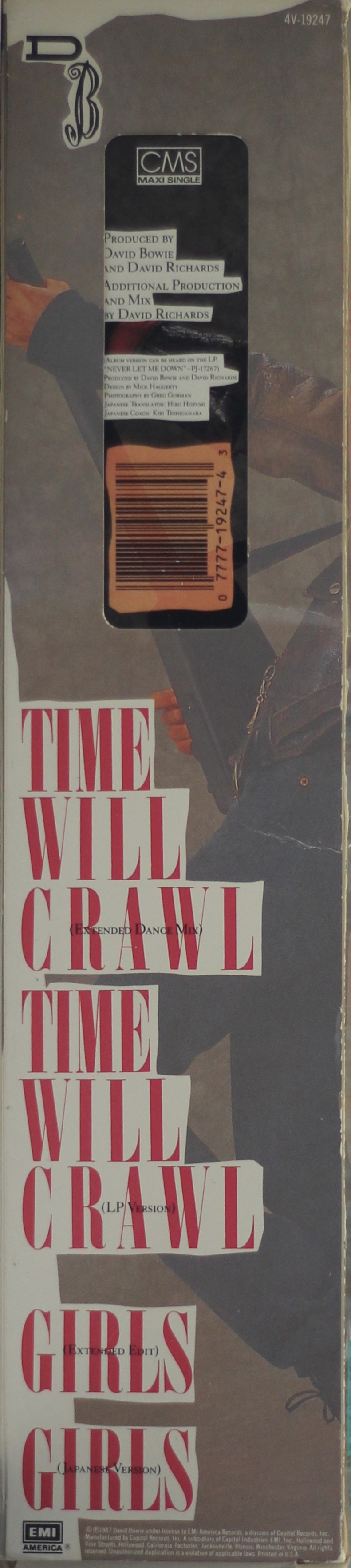 The timings for the tracks are: Time Will Crawl (Extended Dance Mix)(6:06); Time Will Crawl (LP version)(4:15); Girls (extended edit)(5:32); Girls (Japanese version)(3:58).