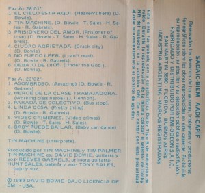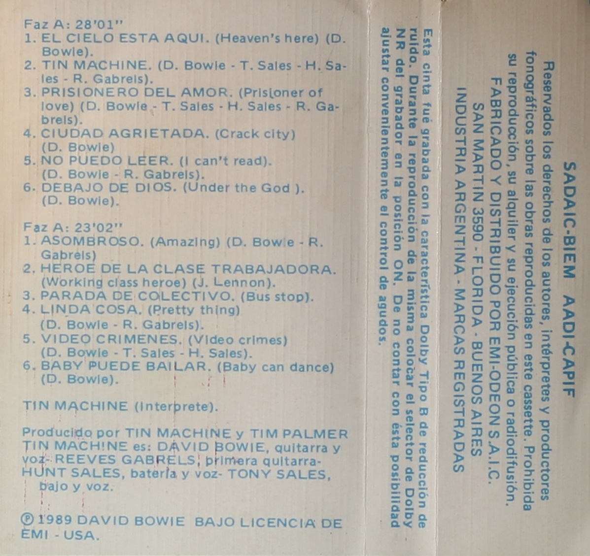 Side 1: El Cielo Esta Aqui (Heaven’s Here); Tin Machine; Prisoner Del Amor (Prisoner Of Love); Ciudad Agrietada (Crack City); No Puedo Leer (I Can’t Read); debajo De Dios (Under The God).