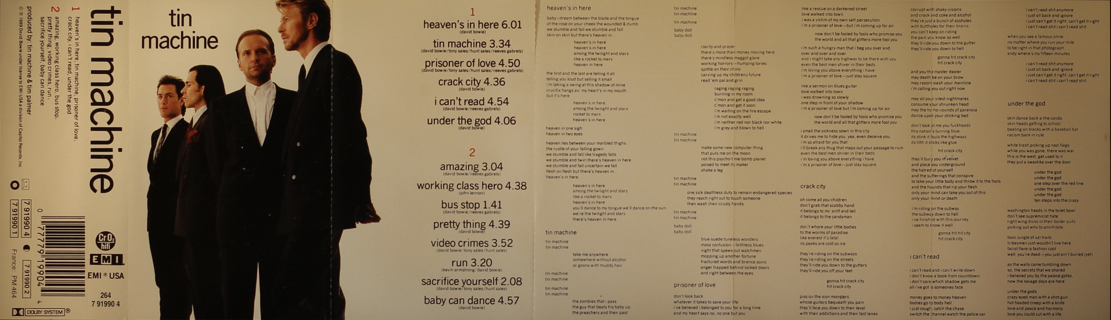 Side 1: Heaven’s In Here; Tin machine; Prisoner Of Love; Crack City; I Can’t Read; Under The God.