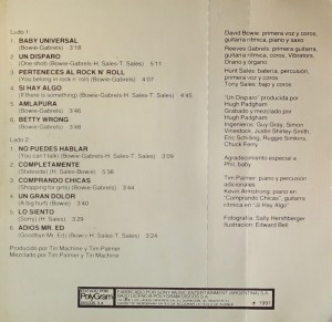 Side 1: Baby Universal; Un Disparo (One Shot); Perteneces Al Rock ‘N’ Roll (You Belong In Rock ‘N’ Roll); Si Hay Algo (If There Is Something); Amlapura; Betty Wrong.