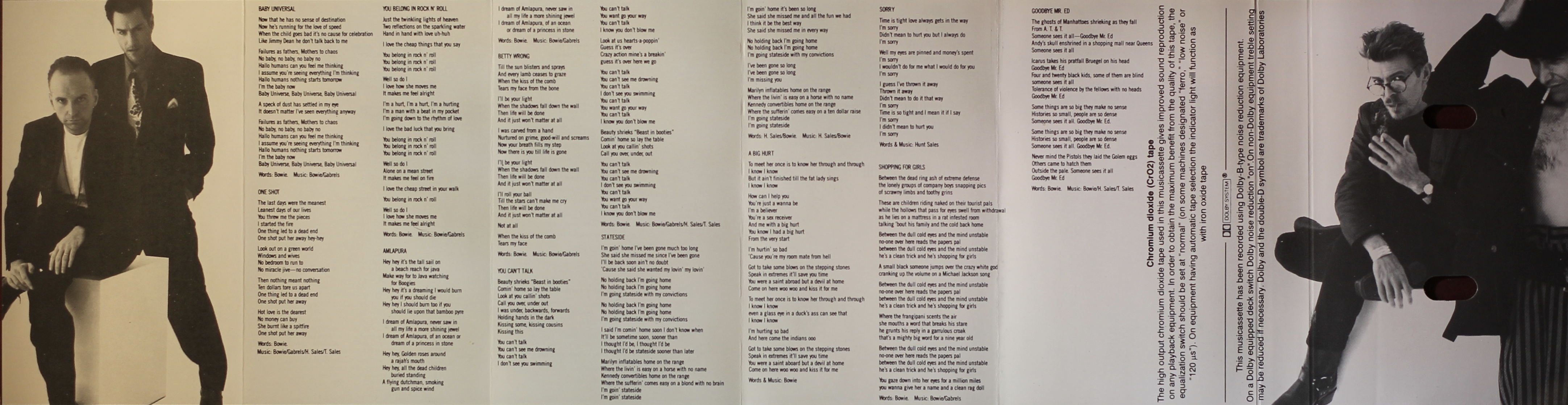 All photo panel concertina cover on glossy paper. Cover photo and track list over first two panels with band information next on the inner panels and lyrics reproduced on the final inside panels. Chrome tape information on the inside cover. ‘London’, ‘Victory’, ‘Chrome Dioxide’ and ‘Dolby’ logos on spine. BIEM/ STEMRA rights logos, French and German marketing information and manufacturers rights to FFRR Records, London on the rear panel. Some copies of this issue came with a label on the packaging advertising the Tin Machine concert at L’Olympia on 29/10/1991.