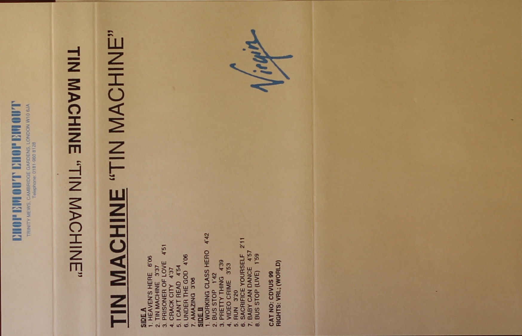 Plain untreated paper cover with logo in blue ink. Cat No: CDVUS 99 and VRL (world) rights on cover. The tape has been mastered by Chop Em Out and their details appear on the rear panel. Produced on unmarked BASF Chrome Super II from DAT to correspond with the 1995 Virgin CD release . Includes the bonus track ‘Bus Stop (live)’.