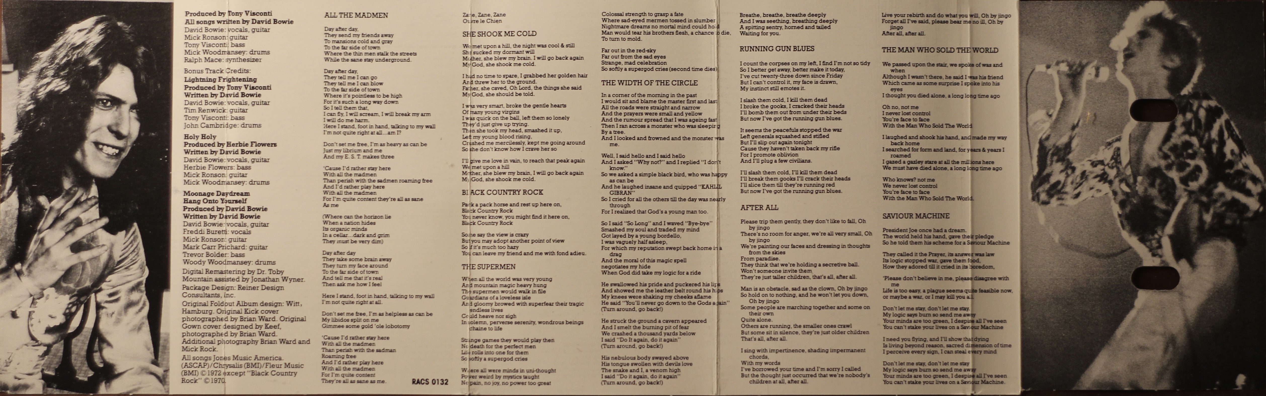 The track sequence has been slightly adjusted from the LP format so that tracks 1 and 2 from side 2 ‘Running Gun Blues’ and ‘Saviour Machine’ have been added as the last tracks on side 1 to give room for the bonus tracks: ‘Lightning Frightening’, ‘Holy Holy’, ‘Moonage Daydream’ and ‘Hang Onto Yourself’ on side 2.