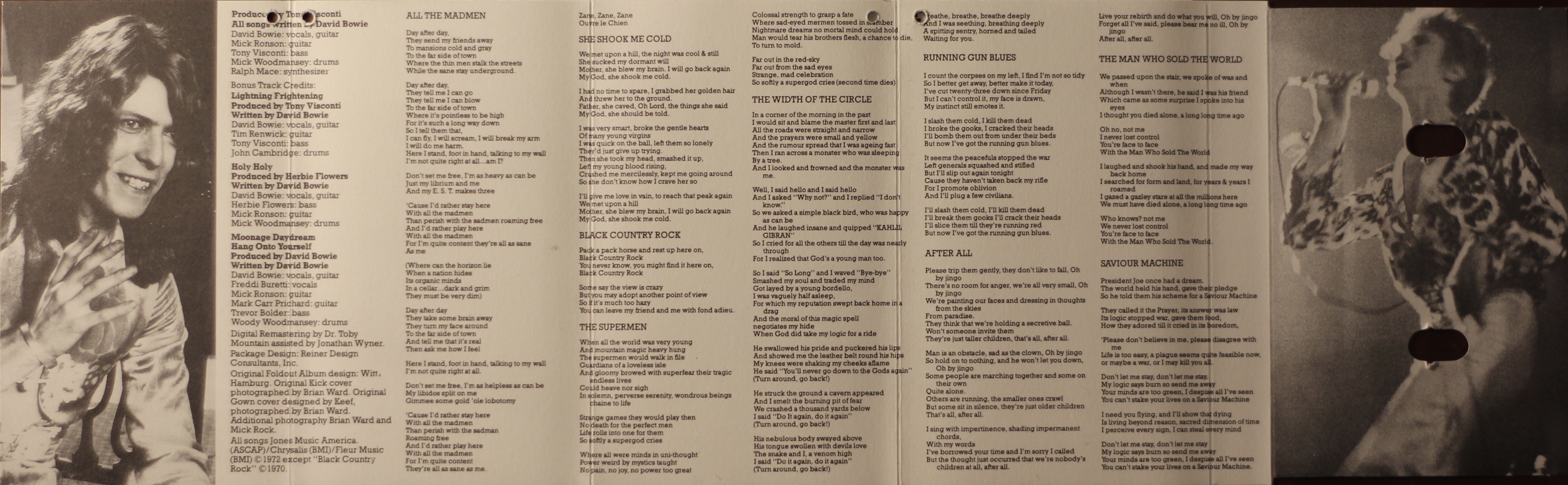 The track sequence has been slightly adjusted from the LP format so that tracks 1 and 2from side 2 ‘Running Gun Blues’ and ‘Saviour Machine’ have been added as the last tracks on side 1 to give room for the bonus tracks: ‘Lightning Frightening’, ‘Holy Holy’, ‘Moonage Daydream’ and ‘Hang Onto Yourself’ on side 2.