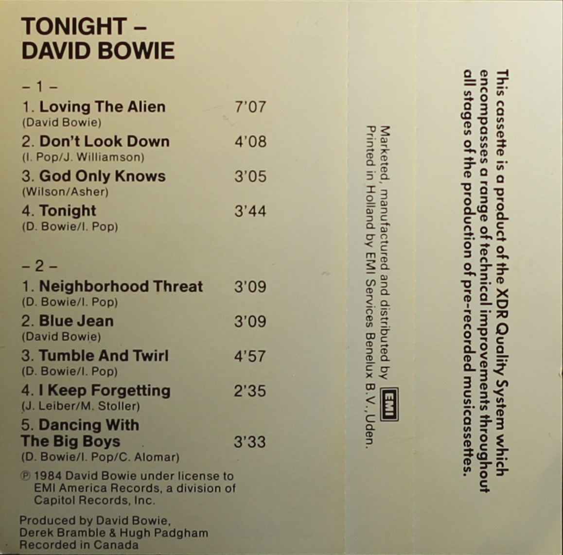 XDR was a process developed by Capitol Records to provide higher quality audio and is the American branding of their original Canadian SDR (Super Dynamic Range) released a year earlier. SDR Let’s Dance tape is available under the Canadian Let’s Dance page.