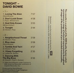 Side 1: Loving The Alien; Don’t Look Down; God Only Knows; Tonight.