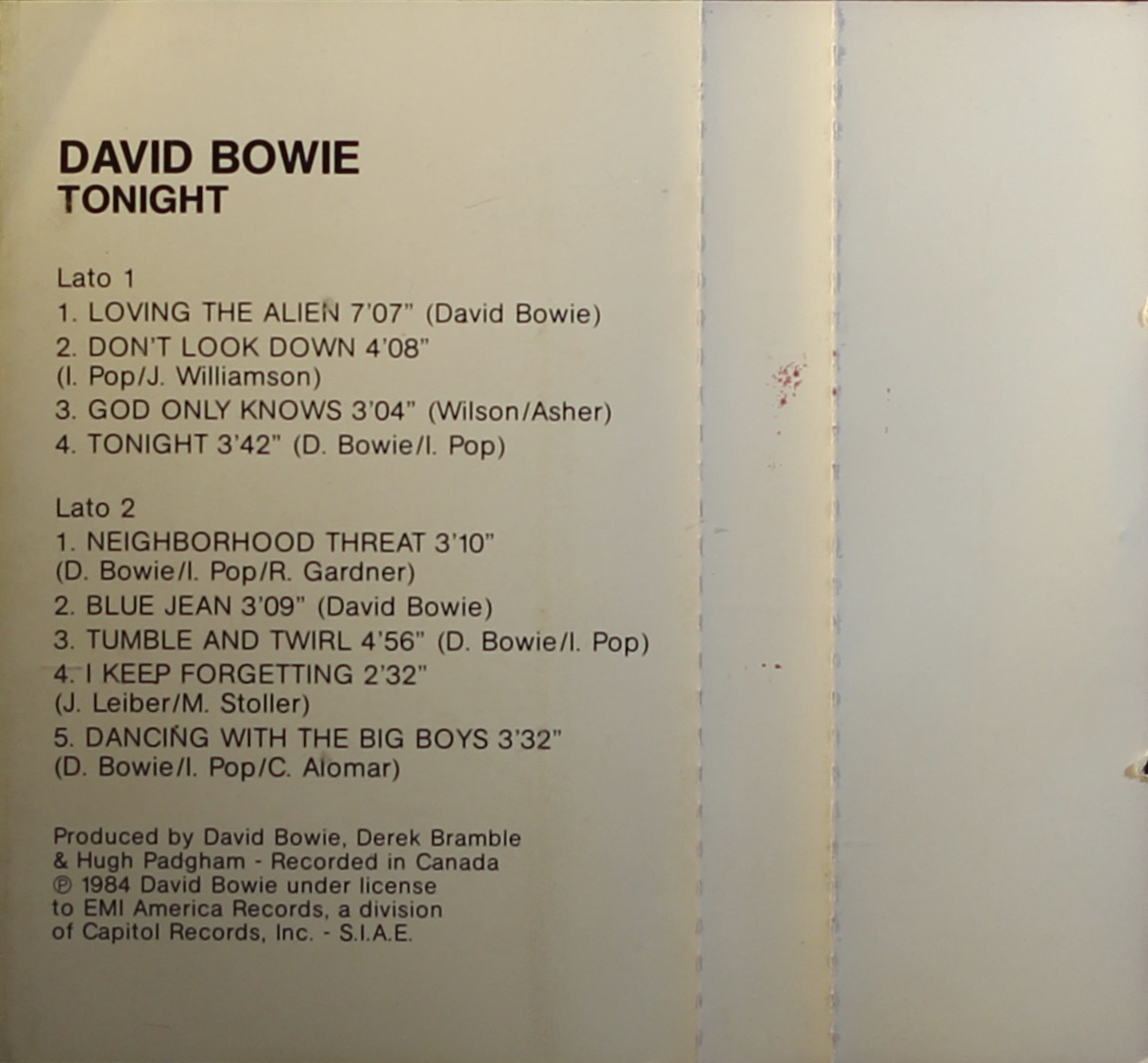 Side 1: Loving The Alien; Don’t Look Down; God Only Knows; Tonight.