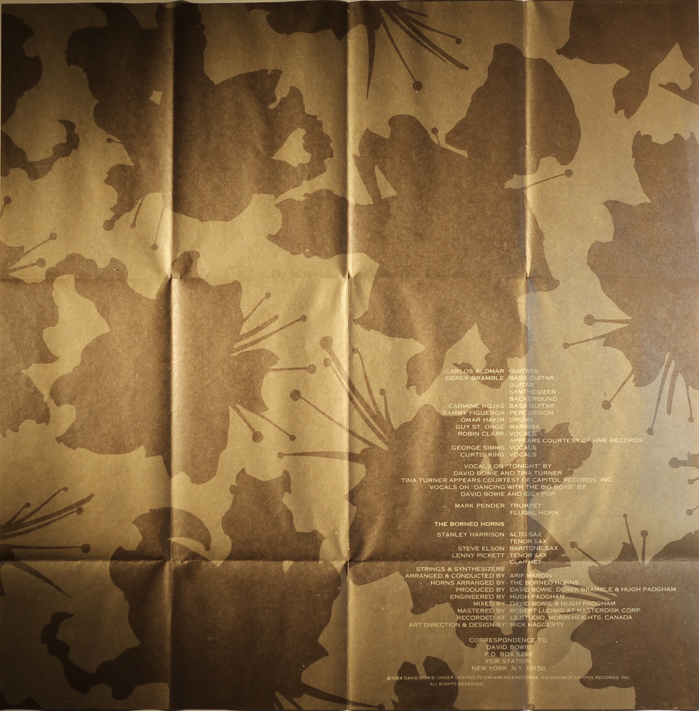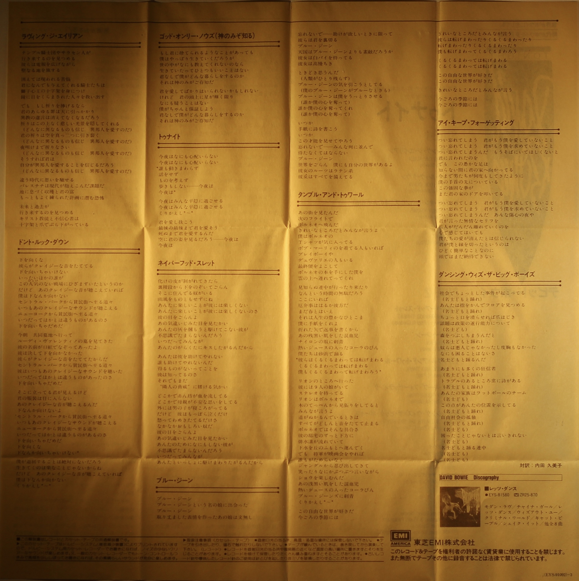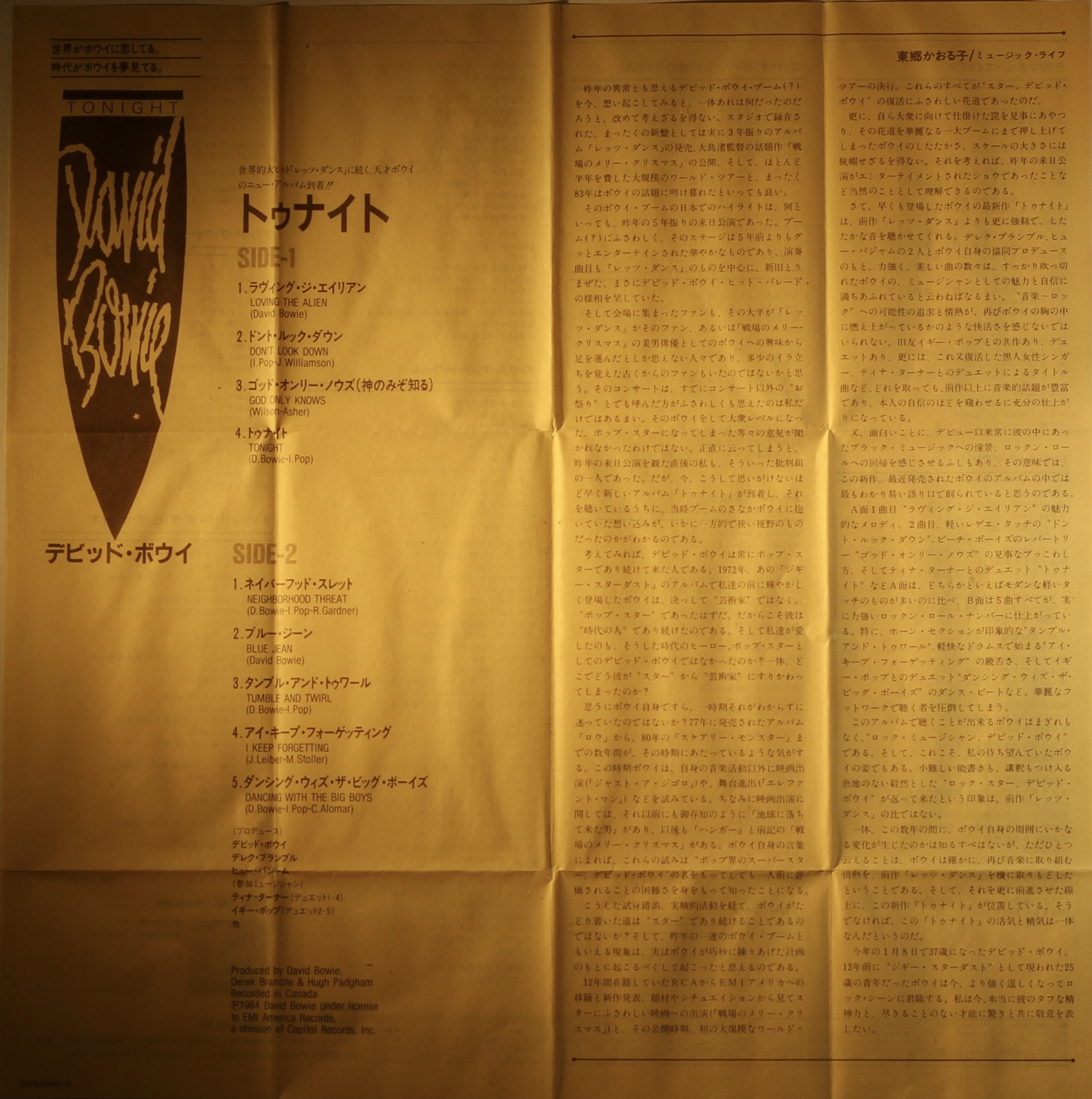 Side 1: Loving The Alien; Don’t Look Down; God Only Knows; Tonight.