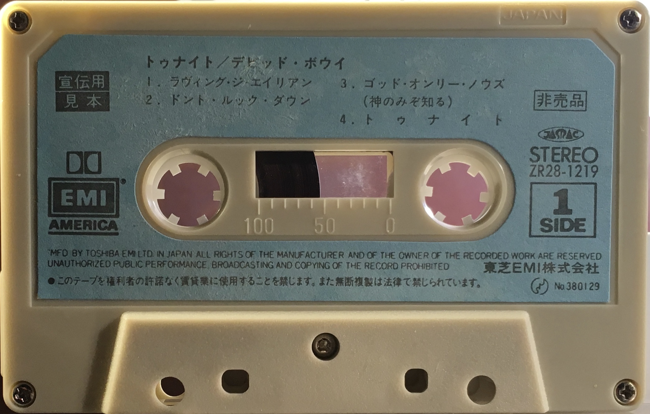 Blue paper label on grey cassette; manufactured by Toshiba EMI. Jasrac rights logo.