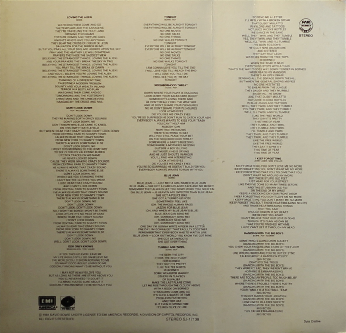 Side 1: Loving The Alien; Don’t Look Down; God Only Knows; Tonight.