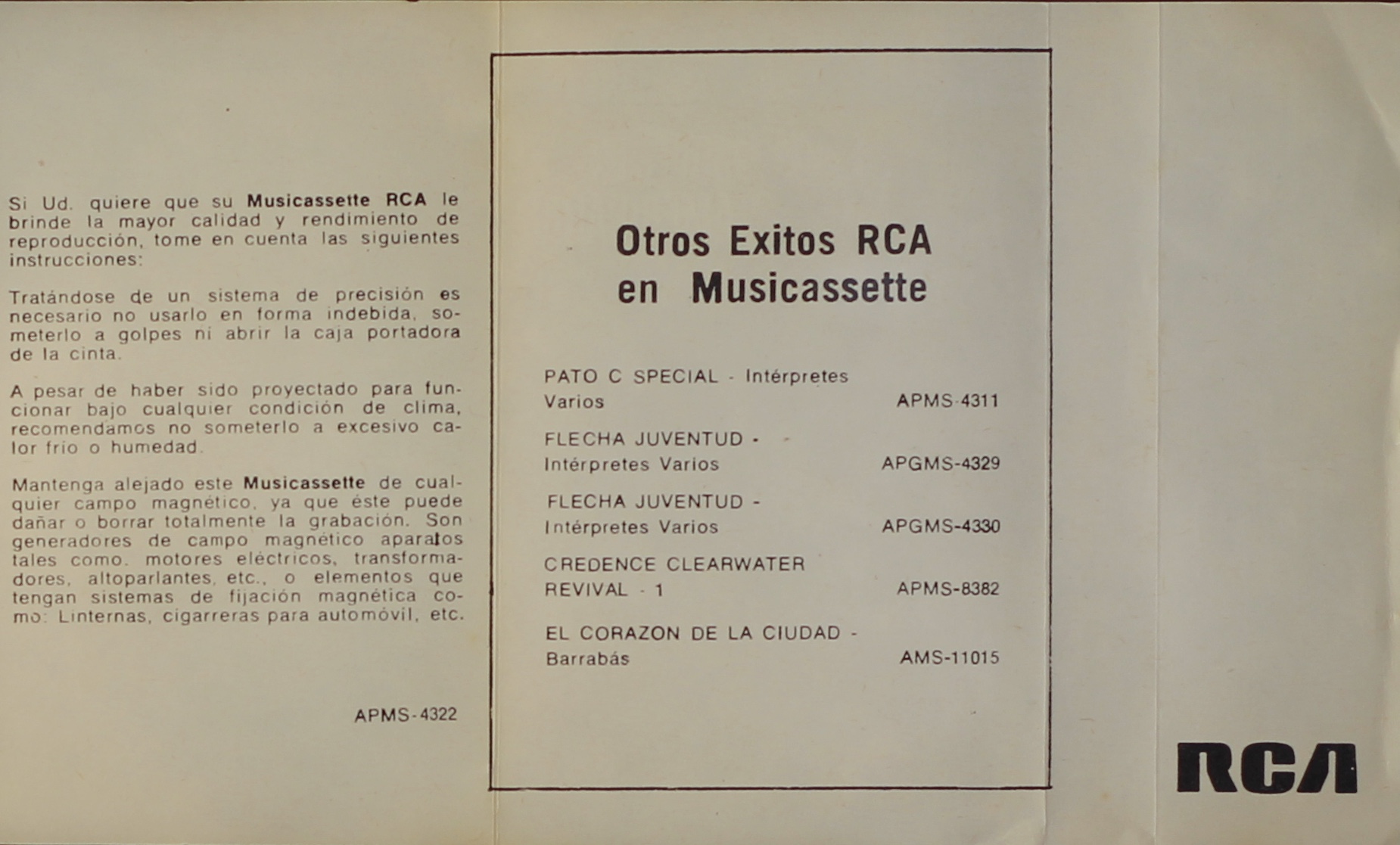 Blue bordered cover photo, spine, rear and inner panels on folded, glossy paper. The inside cover lists other available titles and care information; the track list in Spanish and English is on the rear half-panel and inner panel.