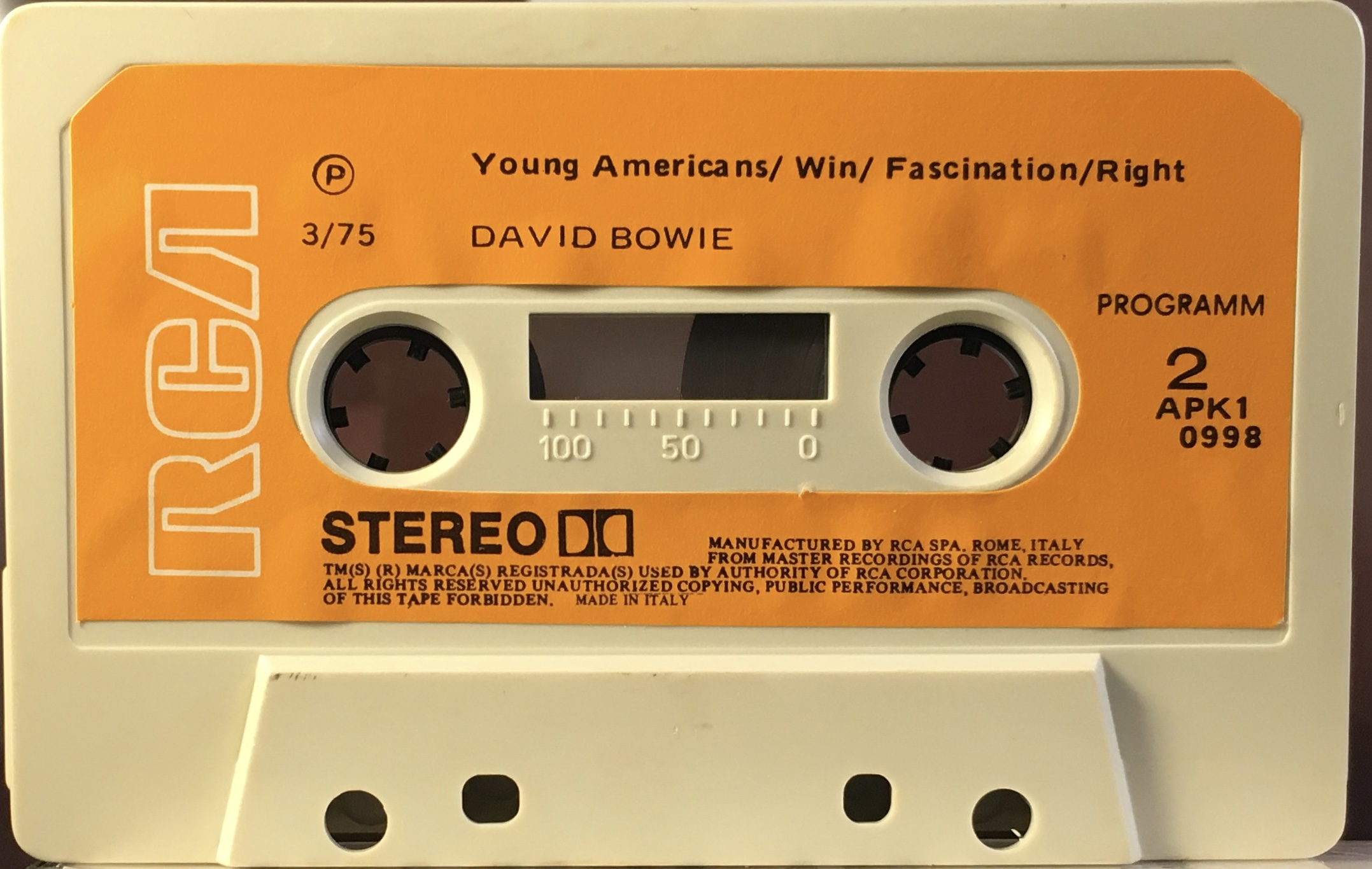 RCA Orange label with hollow white RCA logo or Italian red label with hollow black RCA logo on white cassette. Both cassettes shown have “Manufactured by RCA SPA Rome, Italy from master recordings of RCA Records” and “Made In Italy”.