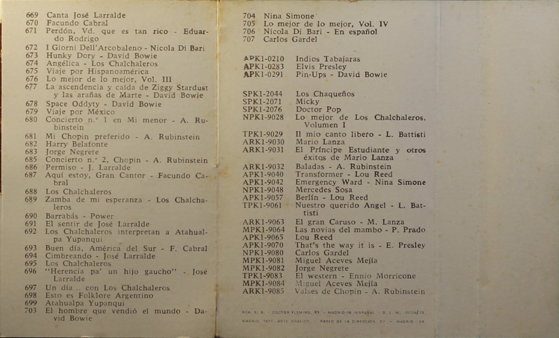 The cover is folded and perforated, glossy paper. The inside cover is blank; the track list is on the rear tab and inner cover. The cover states Cara A & B for the sides but the cassette shows 1 & 2. The RCA address information has been moved from the inner cover as on the first issue and added to the rear tab.