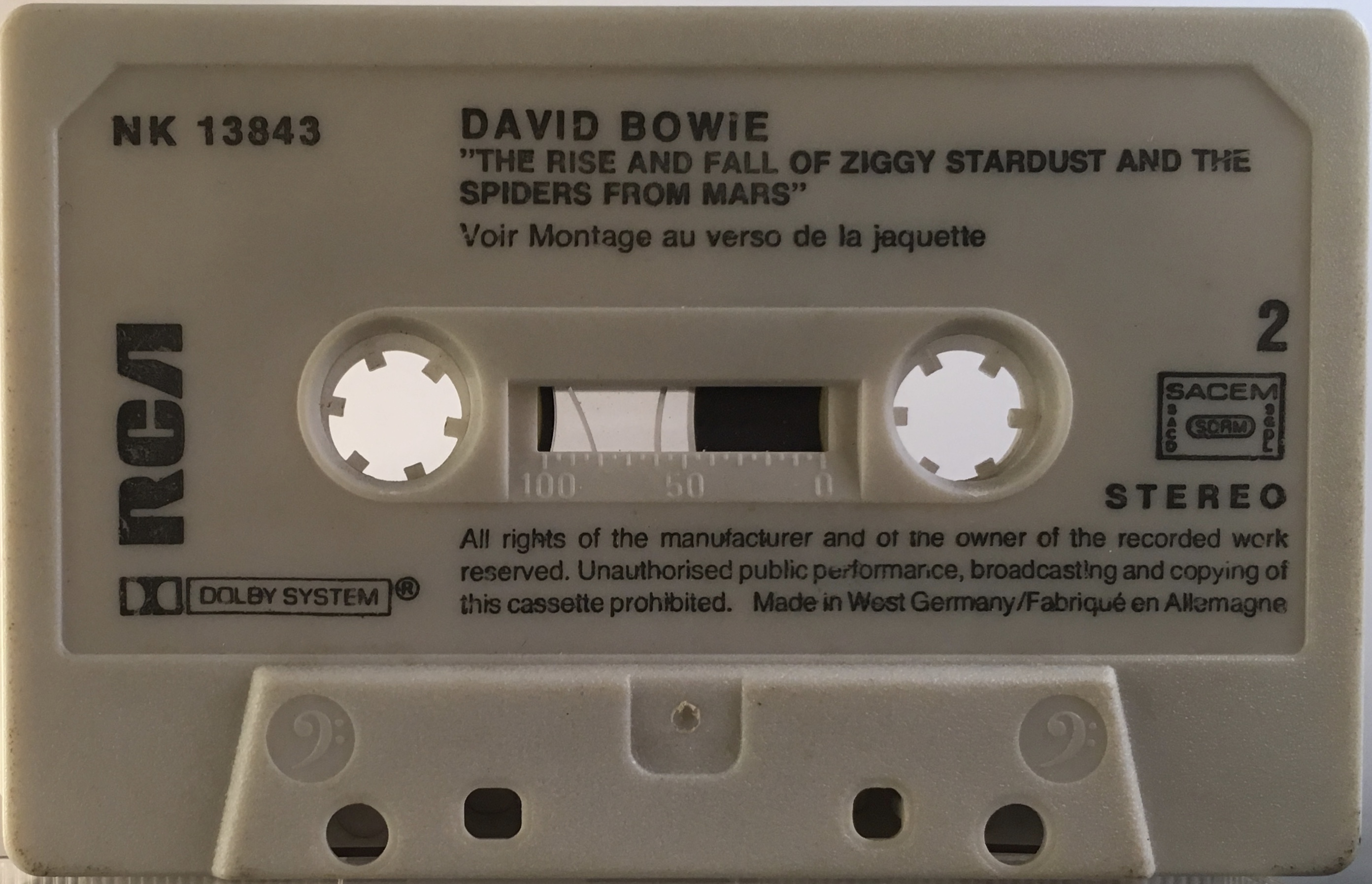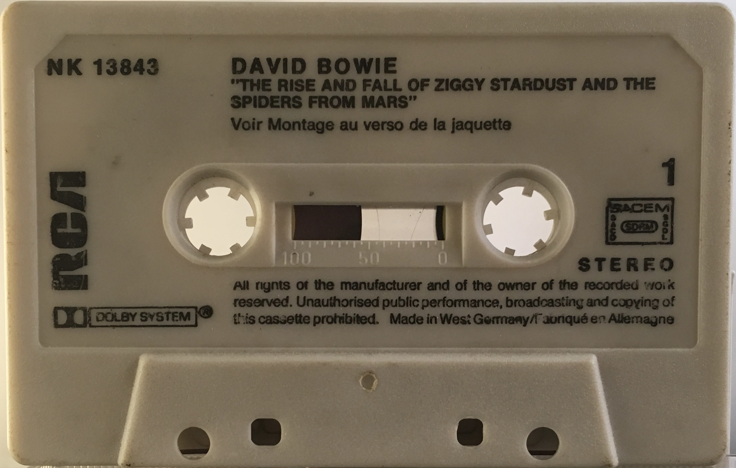 The ‘bass clef’ symbol embossed either side of the cassette bulge indicates it was made by ‘Sonopress’ in West Germany and SACEM rights are printed onto it. Titles and copyright information on both sides is in English
