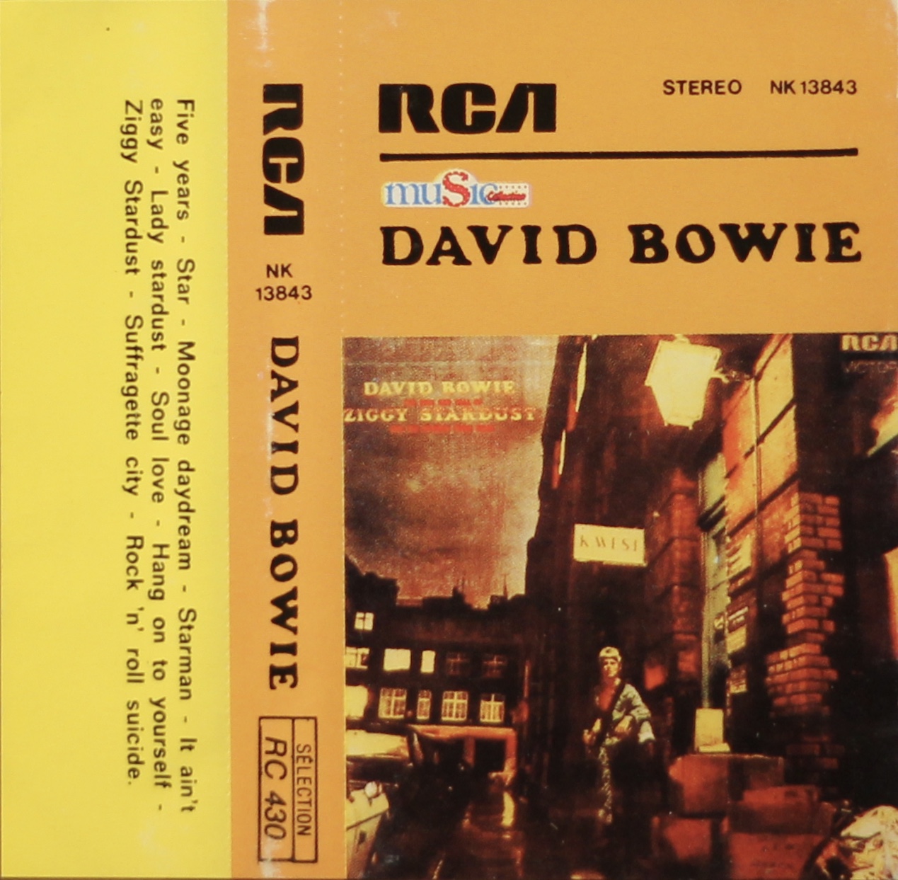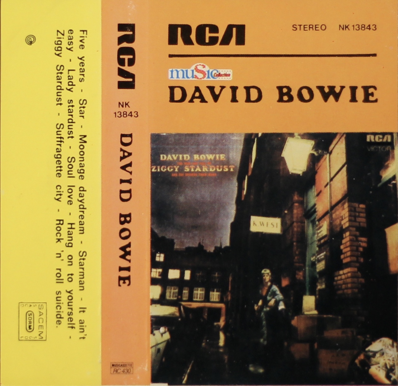 The cover has been copied from the UK issue and has an orange top and spine with yellow back. Price indicator ‘Musicassette RC 430’ appears on the lower spine. The symbol beneath the SACEM stamp and on the rear panel is the logo for ‘Mood Duplication’.