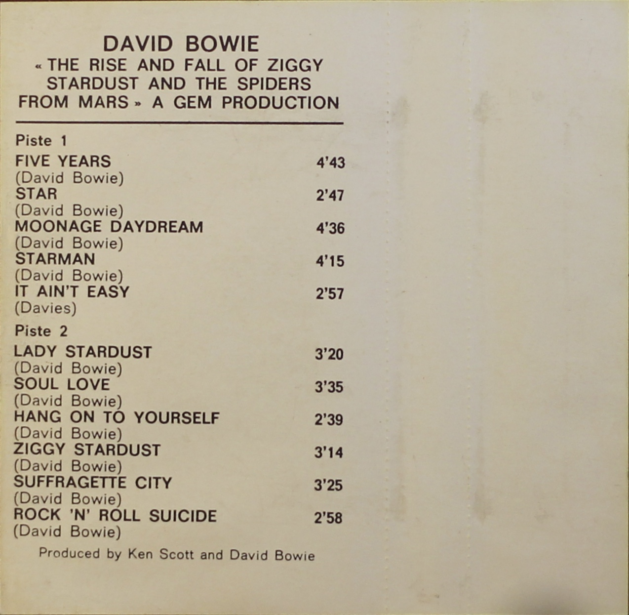 Side 2: Lady Stardust; Star; Hang On To Yourself; Ziggy Stardust; Suffragette City; Rock ‘n’ Roll Suicide.