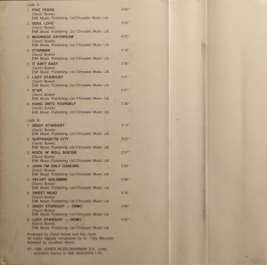 The track sequence has been slightly adjusted from the LP format so that tracks 1, 2 and 3 from side 2 ‘Lady Stardust’ and ‘Star’ and ‘Hang Onto Yourself’ have been added as the last tracks on side 1 to give room for the bonus tracks: ‘John I’m Only Dancing’, ‘Velvet Goldmine’, ‘Sweet Head’, ‘Ziggy Stardust (original demo)’ and ‘Lady Stardust (original demo)’.